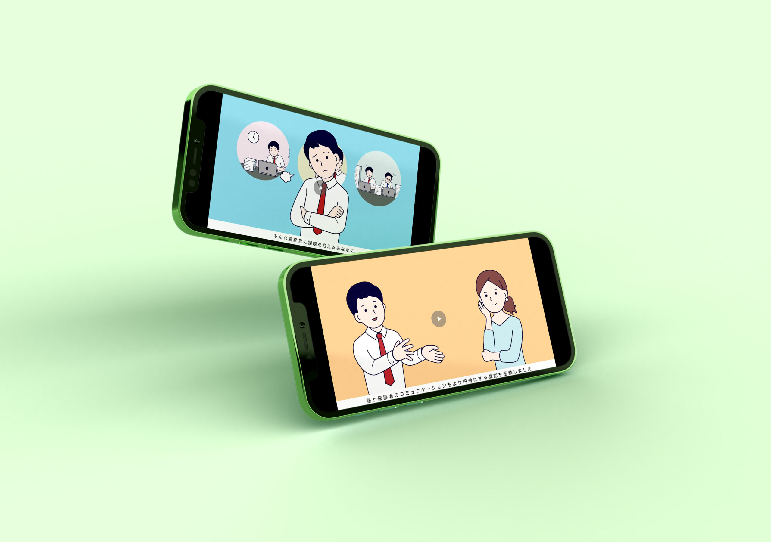事務作業や人材不足、システムの活用方法について課題を抱える塾経営者に向けた塾管理システムの紹介動画です。親しみやすく無駄のないアニメーションで、動画を見ればサービスについて理解できるつくりになっています。